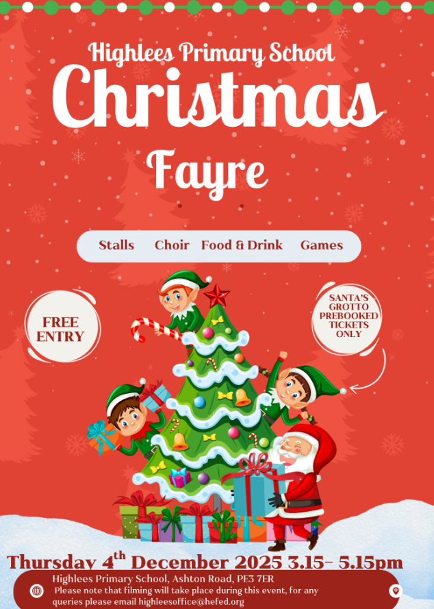 @Highlees 1 month agoCome and join us for our Christmas Fayre on Thursday the 4th of December at 3.15pm. Santa tickets are available to purchase each morning from the school office between 11am and midday. Tickets are £3.50 per child. Correct cash only please. https://t.co/S4i2tZEjSm